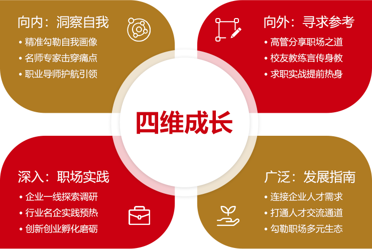 从“向内”、“向外”、“深入”和“广泛”四个维度促进学生们的职场成长,并通过一系列专业的测评、咨询、交流和实践,让学生们真正做到知行合一,实现个人身份和职业生涯的无缝衔接与转型升级。
